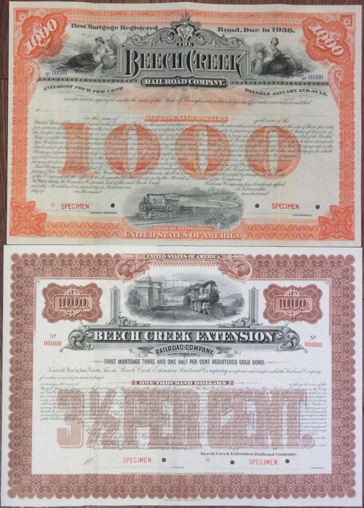 Pennsylvania, 1886 and 1901. Lot of 2 Specimen bonds, Includes: 1886, $1000 Specimen 4% First Mortgage Registered Bond with orange border and underprint; and, 1901, Beech Creek Extension Railroad Company $1000 Specimen 3.5% First Mortgage Registered Gold Bond with brown border and undertint. Both have red specimen overprints, 00000 serial numbers, POCs, and are in VF condition. ABN. The brown bond is a rare specimen in Cox. (2)