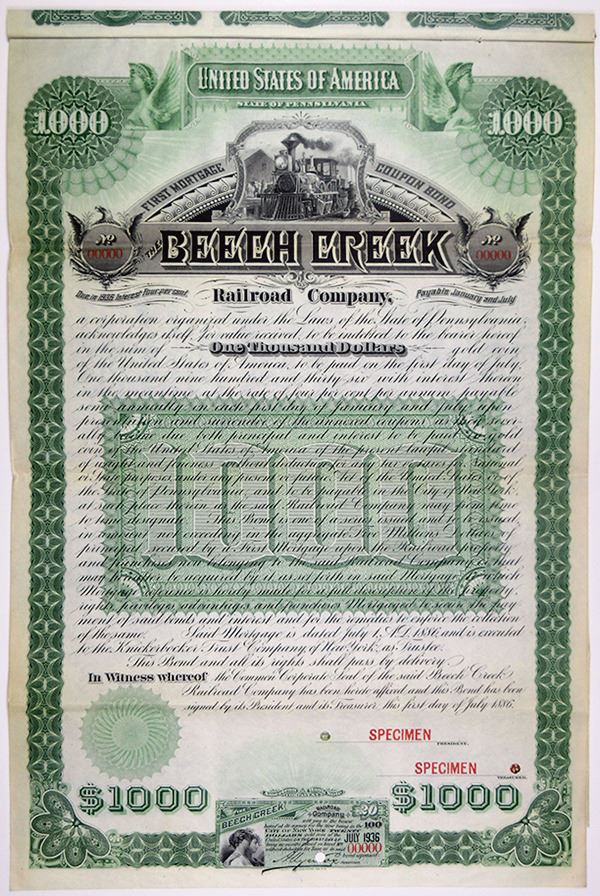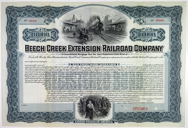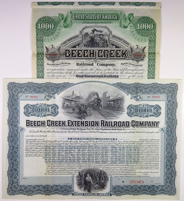 Pennsylvania. Lot of 2 Bonds, Both are Beech Creek Railroad-related Specimen Bonds: One is 1886 $1000 4% First Mortgage Coupon Bond for the Beech Creek Railroad Company in green with a small train vignette at top. The other is not dated, $10,000 Registered 4% Consolidated Mortgage Gold Bond for the Beech Creek Extension Railroad Company in navy blue with a train approaching station vignette at top and coal miners at work at the bottom. Both have red specimen overprints, serial numbers, and POC's and in VF condition. Printed by ABNC. (2)