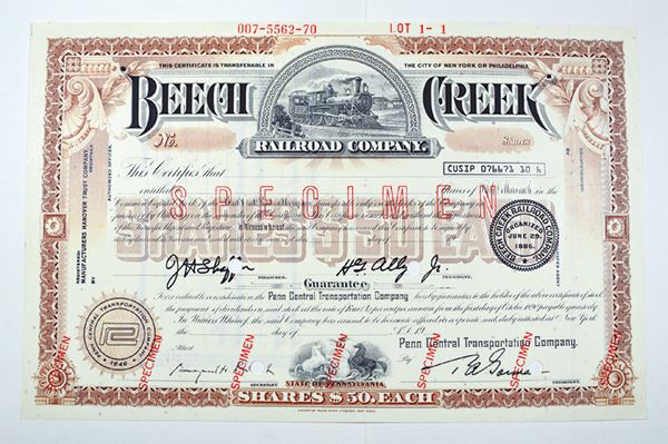 Pennsylvania. Odd Shares Common Capital Stock Specimen Certificate, Black print on brown border and under tint, Locomotive at top between company title, Specimen overprints and POC's, VF-XF condition, ABNC.