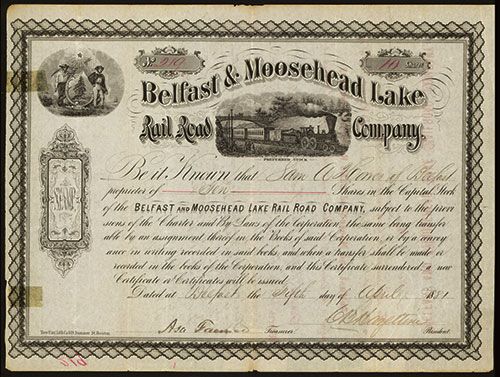 Maine, 1881, 10 Shares, Issued Stock, Black on black border and underprint, Vignette of moving locomotive under small bridge top center vignette of two men standing by Maine's crest top left, VF-XF condition, New England Lithography.