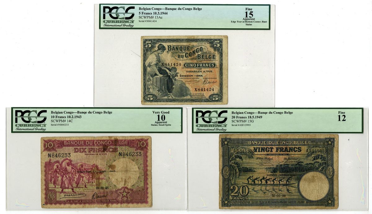 Belgian Congo, 1944-49. Lot of 3 Issued Banknotes, Includes: 5 Francs, P-13Ac, 1944, PCGS graded Fine 15 Apparent with comments "Edge Tear at Bottom Center; Rust Stains," W& S; 10 Francs, P-14C, 1943, PCGS graded Very Good 10 Apparent with Comments "Stains; Small Splits," W& S; 20 Francs, P-15G, 1949, PCGS graded Fine 12, TDLR. (3). Sold "AS IS" no returns accepted.