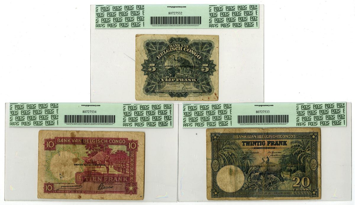 Belgian Congo, 1944-49. Lot of 3 Issued Banknotes, Includes: 5 Francs, P-13Ac, 1944, PCGS graded Fine 15 Apparent with comments "Edge Tear at Bottom Center; Rust Stains," W& S; 10 Francs, P-14C, 1943, PCGS graded Very Good 10 Apparent with Comments "Stains; Small Splits," W& S; 20 Francs, P-15G, 1949, PCGS graded Fine 12, TDLR. (3). Sold "AS IS" no returns accepted.