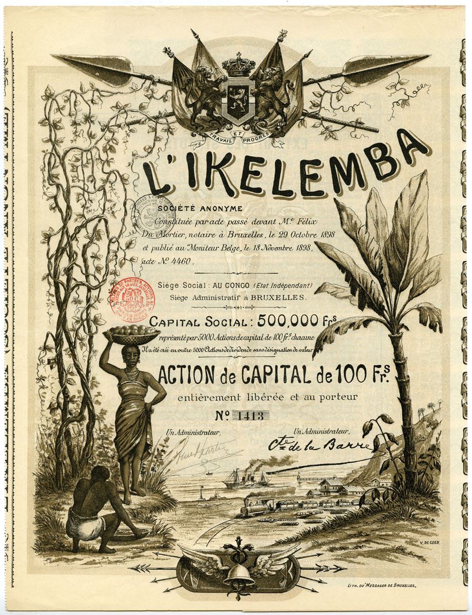 Belgian Congo, 1898. Capital Share of 100 Francs I/U Bond in French, S/N 1413, With coupons on back, Black text with ornate black and brown border, Seal at top center, Pair of handstamps at center. VF condition.