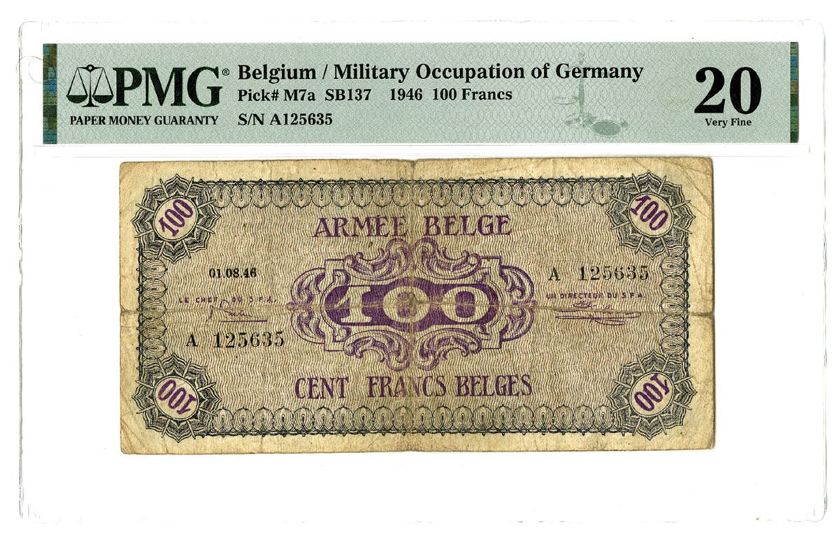 Belgium - German Occupation WWII, 1946. 100 Francs, P-M7a, Issued Banknote, Gray-blue and violet printing with denomination at center, Back is gray-blue with bank title at center, S/N A125635, PMG graded Very Fine 20.