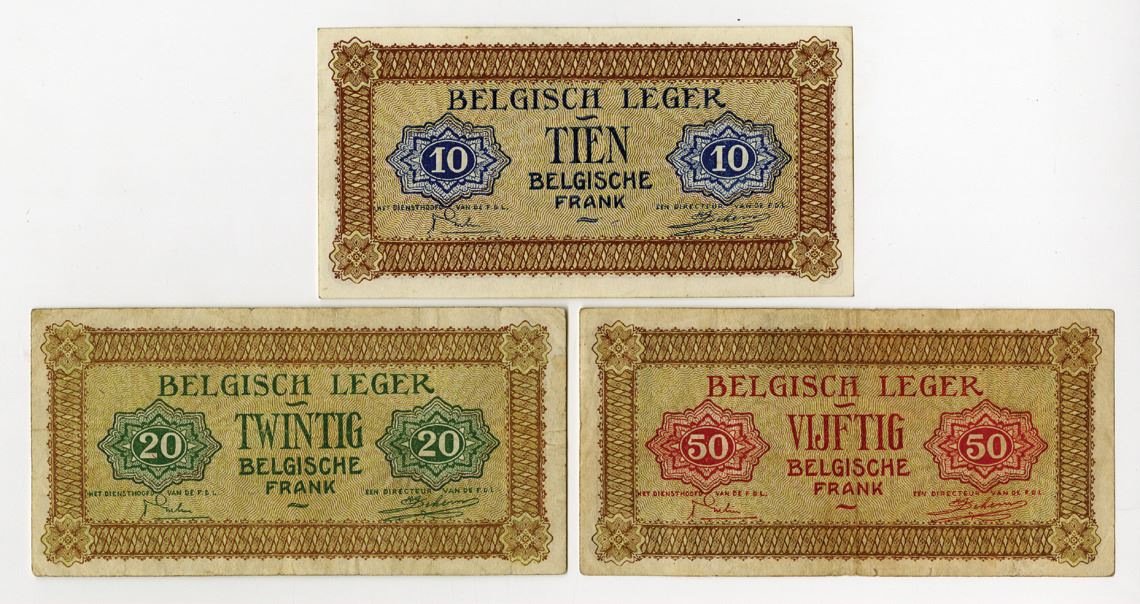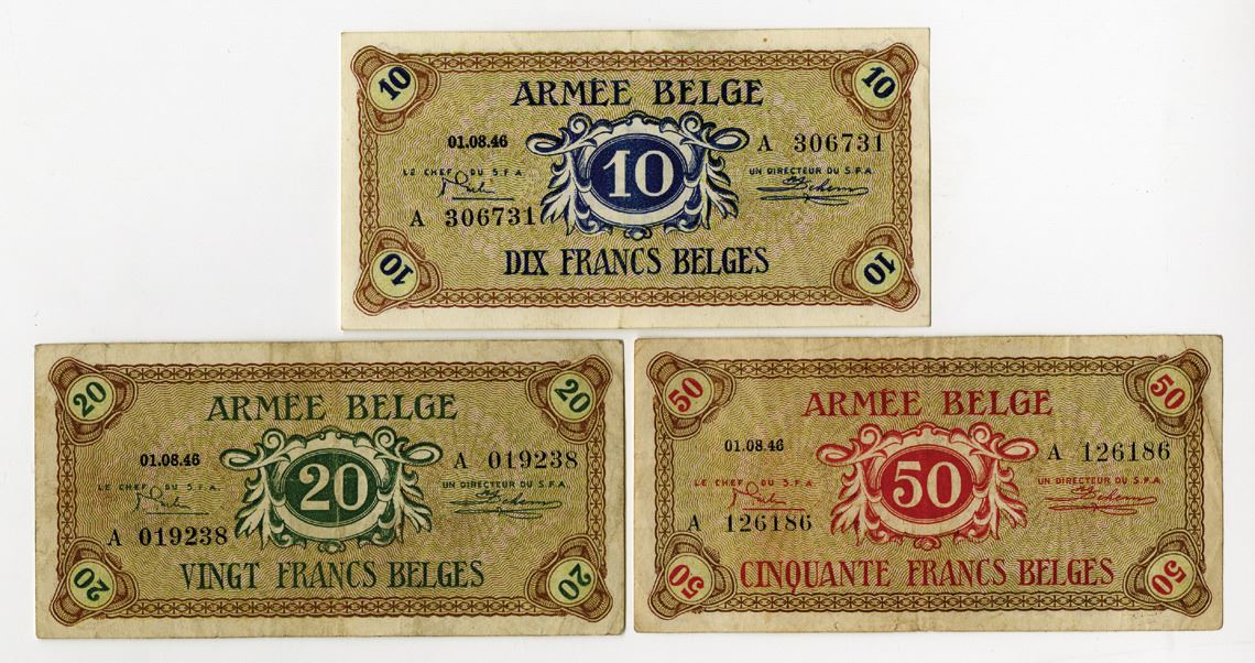 BelgiumÉ., 1946. Lot of 3 Issued Military Payment Certificates: 10 Francs, P-M4a, S/N A 306731, Choice VF-XF; 20 Francs, P-M5a, S/N A 019238, VF; and 50 Francs, P-M6a, S/N A 126186, VF. (3). Sold "AS IS" no returns accepted.