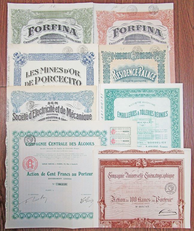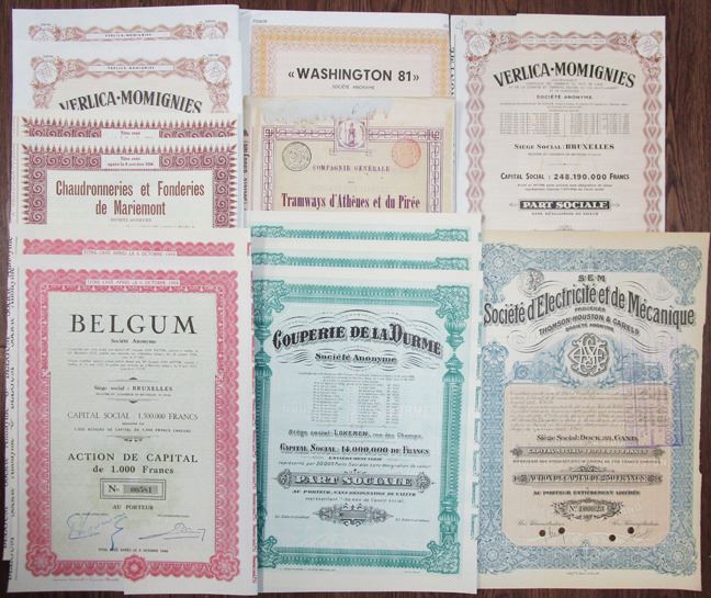 Belgium....., 1900-1940s. Collection of 23 I/U and I/C Bonds from Belgium. Includes Compagnie Centrale des Alcools, Residence Palace Societe Anonyme, Emailleries & Toleries Reunies Lesmines d'or de Porcecito and more. Bonds range from VF to XF condition. Sold "AS IS" no returns accepted. (23).