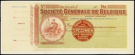 19-- (ca.1900-1910). Brussels. Specimen check by Bradbury Wilkinson and Co. Red circular BWC overprint in middle. Allegorical vignette on left. Red on light green undertint. Uncirculated. BWC. Scarce specimen. Glued to white paper on left and middle.