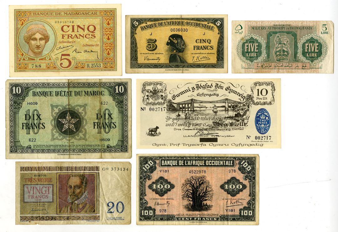 Belgium....., Wales, Morocco, French West Africa, Tripolitania, and Madagascar, ca. 1930-60s, Lot of 7 Issued Banknotes, Including: Royaume de Belgique (1); Black Sheep Co. of Wales Ltd (1); Banque d'Etat du Maroc (1); Banque de l'Afrique Occidentale (2); Military Authority in Tripolitania (1); and Banque de Madagascar (1). Condition varies from Fine-VF. Sold "AS IS" no returns accepted. (7)
