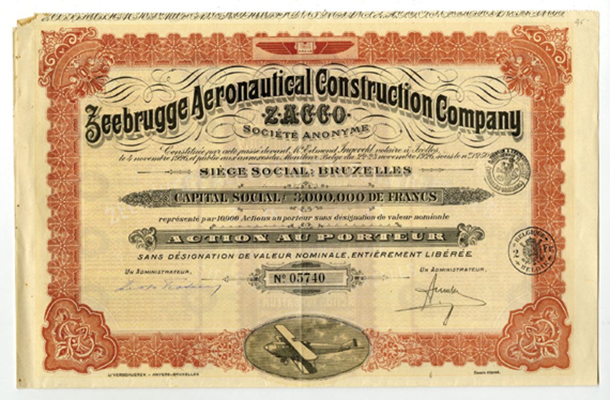 Brussels, Belgium, 1926. I/U Certificate, Black print with brown border and tan underprint, Company title at top with small aircraft at bottom, S/N 05740, Fine to VF+ condition.