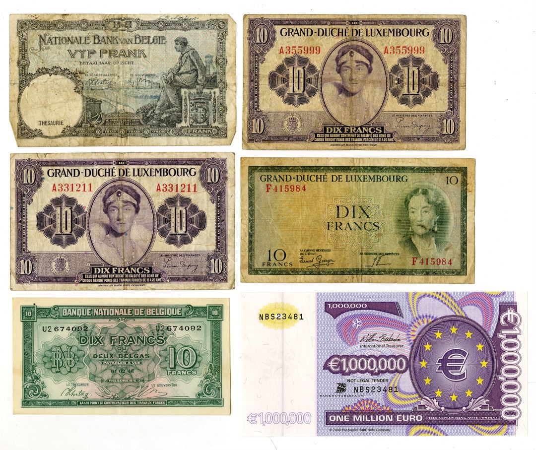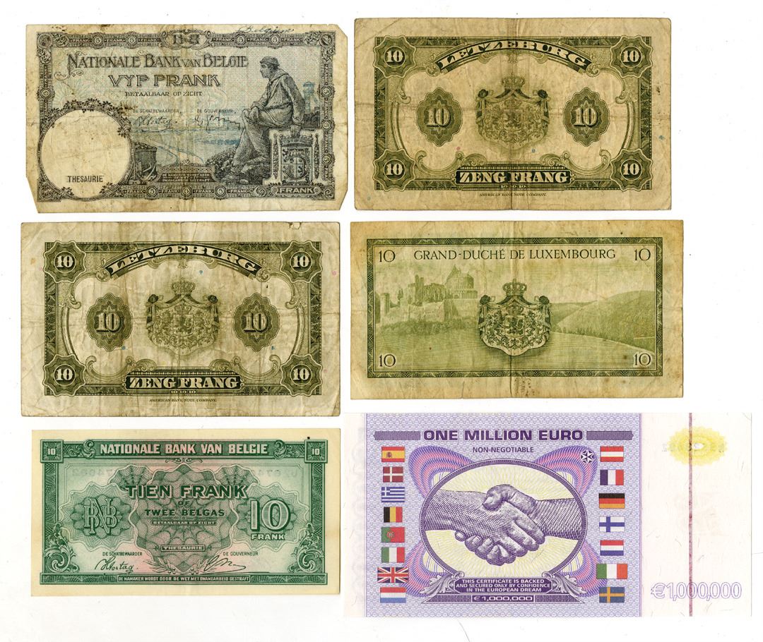 Belgium and Luxembourg......, 1938-2000, Lot of 6 Issued Banknotes, Including: National Bank van Belgie (1); Banque Nationale de Belgique (1); Grand-Duche de Luxembourg (3); and Naples Bank Note Co. (1). Condition varies from Fine-VF. Sold "AS IS" no returns accepted. (6)