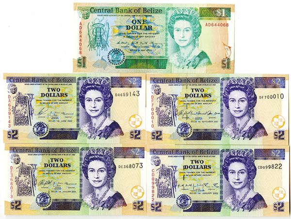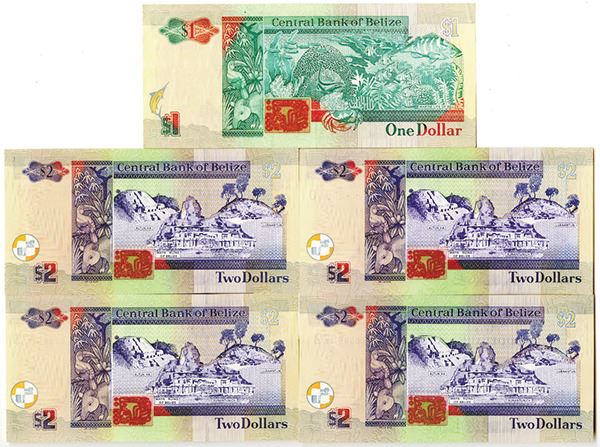 Belize, ca. 1990-2000s. Lot of 5 Issued notes, includes 4 examples of the $2 in AU to Uncirculated condition; One $1, AU condition. 5 pieces.