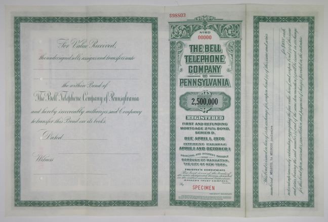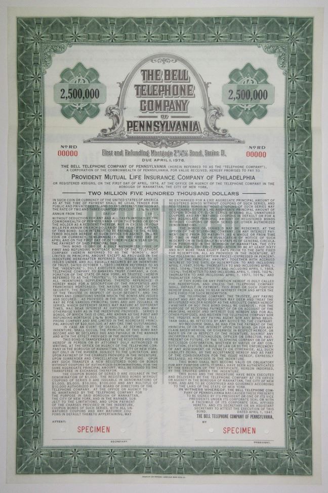Bell Telephone Co. of PA, 1941 Specimen 2.75% First Mortgage Bond, XF. Verizon Pennsylvania LLC, formerly traded as Bell of Pennsylvania, is the Bell Operating Company serving most of Pennsylvania. The company was founded in 1879 as Bell Telephone Company of Philadelphia, owned by National Bell Telephone Company, which later became American Bell. In 1899, the company became a subsidiary of American Telephone and Telegraph Company following its buyout of American Bell.