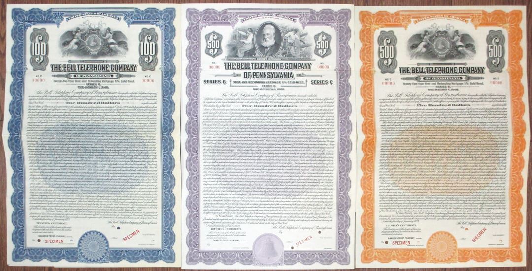 Pennsylvania. Lot of 3 bonds, Includes 1923 $100 Specimen 5% First and Refunding Mortgage Gold Coupon Bond in blue; 1923 $500 Specimen 5% First and Refunding Mortgage Gold Coupon Bond in orange; 1925 $500 Specimen 5% First and Refunding Mortgage Gold Coupon Bond in purple. All have red specimen overprints, 00000 serial numbers, and POCs. VF condition, ABNC. (3)