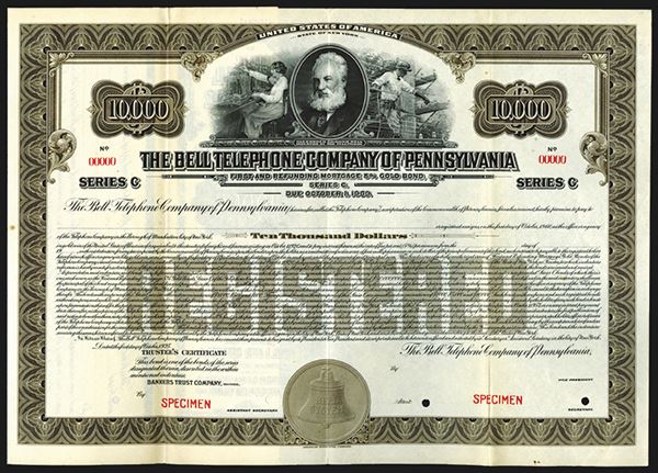 PA. Specimen $10,000 Registered 5% Gold Bond. Brown border and undertint. Alexander Graham Bell flanked by operator and worker on telephone pole. POC. XF Condition. ABNC. Rare bond.
