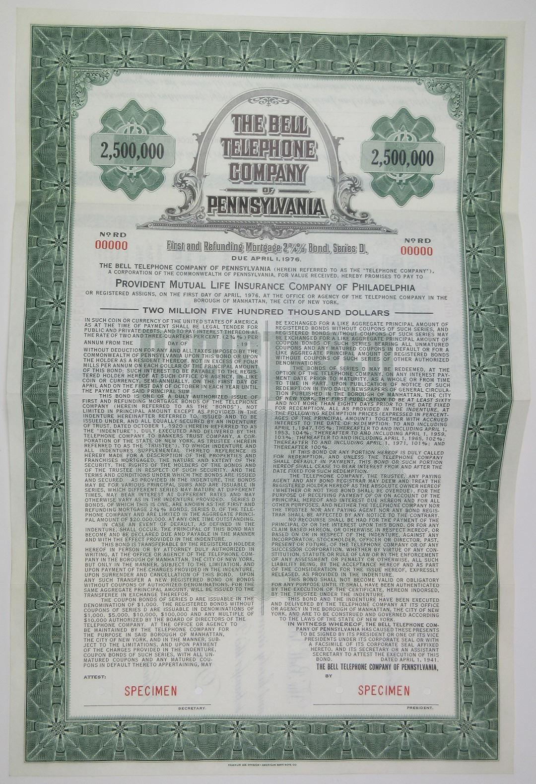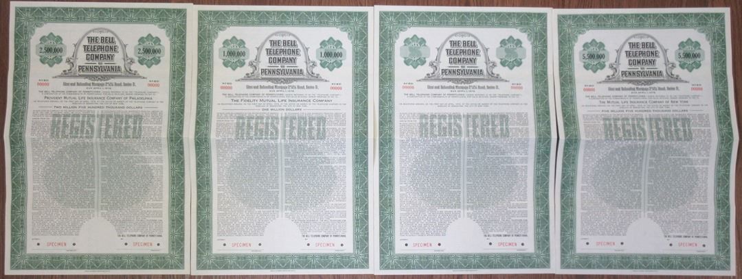 Pennsylvania. Lot of 4 Specimen, 2 3/4% Coupon bonds, All are green with out vignette on top, only title, Includes $-Odd; $1,000,000; $2,500,000 and $5,500,000. All with same design, all with specimen overprints, POC's Red "00000" serial numbers and coupons attached. All in VF-XF condition. Rare high denomination bond set. 3 of the bonds are issued to Fidelity Mutual Life Insurance Company; Provident Mutual Life Insurance Company of Phila,; and Mutual Life Insurance Company of NY; Attractive telephone company bonds rarely seen with this high of denomination. (4)