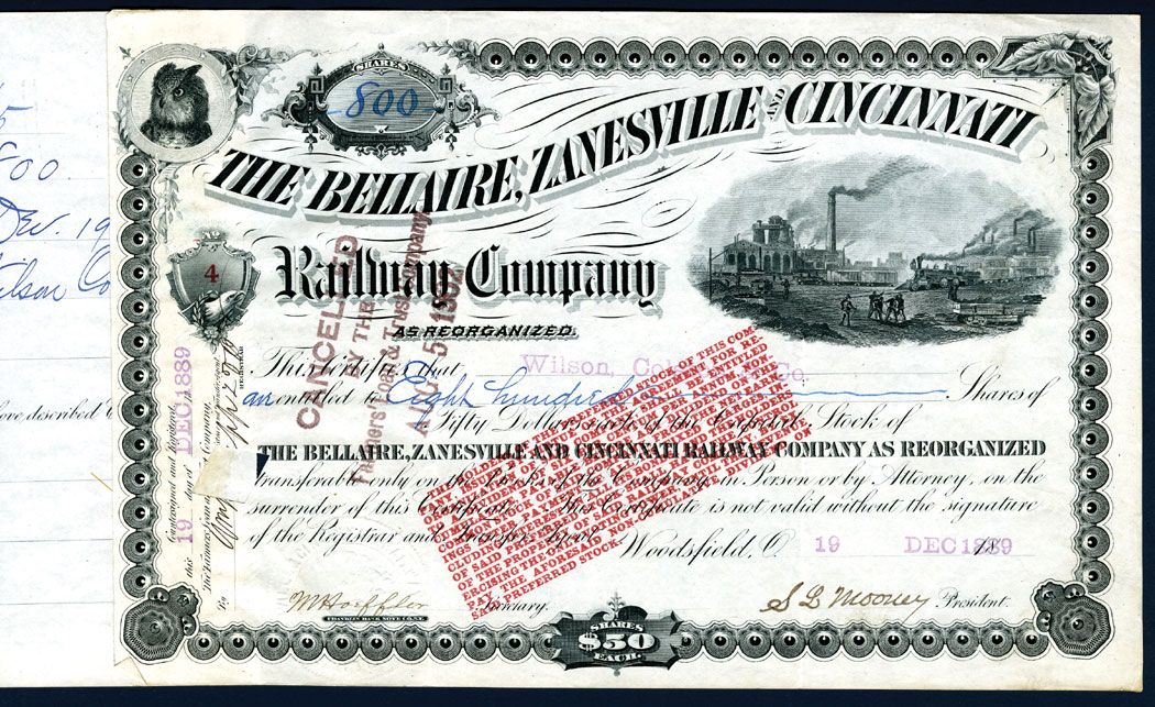 Woodsfield, Ohio, 800 Shares, I/C, Owl on upper left, train and factory right. Red overprint diagonally,