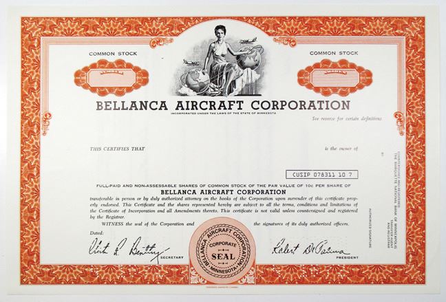 Minnesota, 1972. Odd Shares Specimen Stock Certificate, Black text with brown border, Allegorical woman at top with globes and airplanes. Specimen POCs, VF condition, Federated BN.