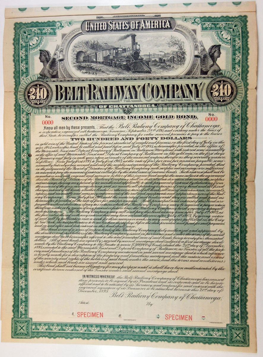 Tennessee, 1895, Specimen $240 2nd Mortgage 4% Income Gold Coupon Bond, black on green border and underprint, Locomotive L-R on top, VF condition with archival reinforcement at top horizontal fold. ABNC. Unlisted railroad in Cox and first time offered by our company. This is one of 2 examples found in the ABN archives in 2002.