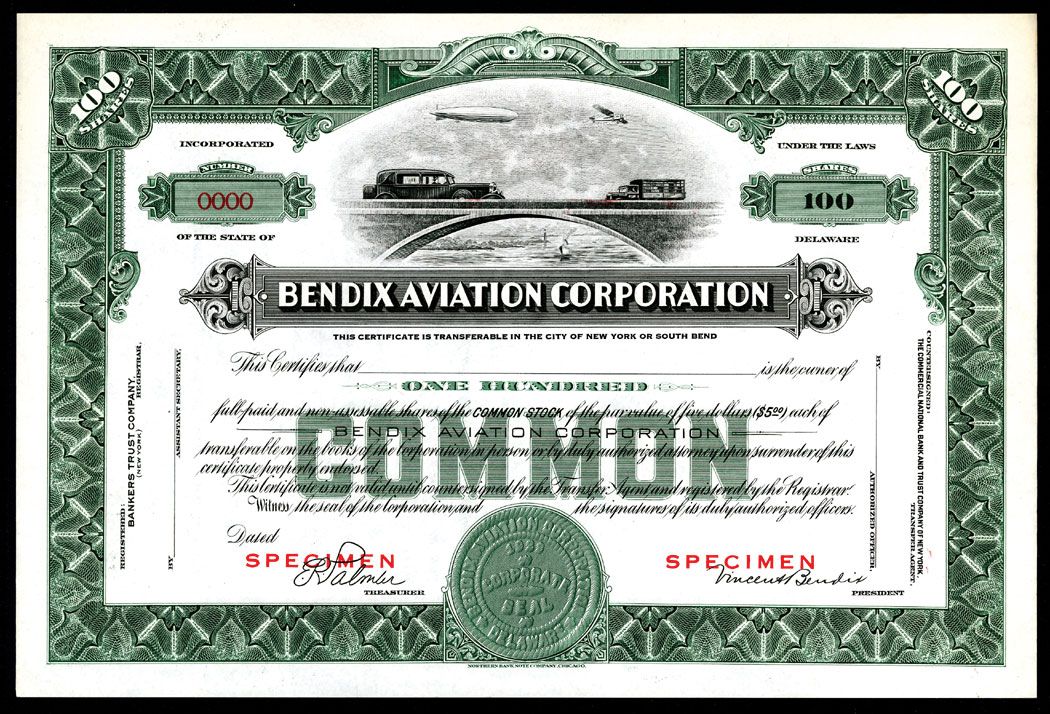Indiana, ND (ca.1920-30's). 100 Shares, Green border. Zeppelin, airplane, limousine and truck vignette. Red specimen overprint and POC. Choice uncirculated condition. Northern BNC. Scarce aviation certificate.
