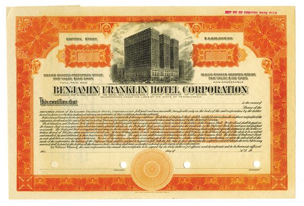 Pennsylvania. Odd Shares Preferred Stock Specimen Certificate, Black print on orange border and under tint, Image of hotel at top, POC's, VF-XF condition, SBNC. Located on Chestnut Street in Philadelphia.