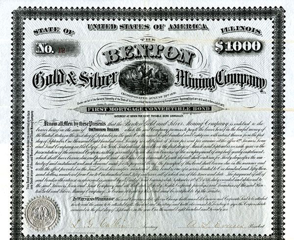 Illinois. 1876. $1000 1st Mortgage Convertible Specimen Bond with coupons attached. #12. Black print with black ornate border and silver underprint and seal. Mining vignette top center. VF condition. Western B.N. & Engraving Co.