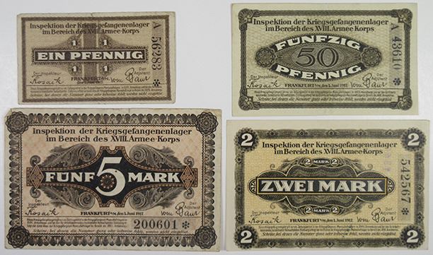 Bereich, Germany. Lot of 4 Prisoner of War Notgeld Scrip Notes, issued for the Bereich XVIII Army Corps. Includes 5 Mark, Fine; 2 Mark, Choice Unc; 50 Pfg, VF-XF; and 1 Pfennig, Fine. (4)