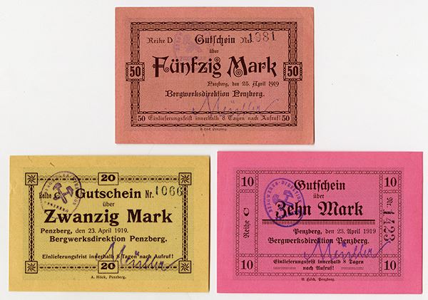 Pemberg, Germany. Lot of 3 notes, includes 10 Mark; 20 Mark and 50 Mark notes, all are Uncirculated. The title of the company is "Mine Management Pemberg" so I assume these Notgeld are mining scrip. All are Uncirculated. Scarce. (3)