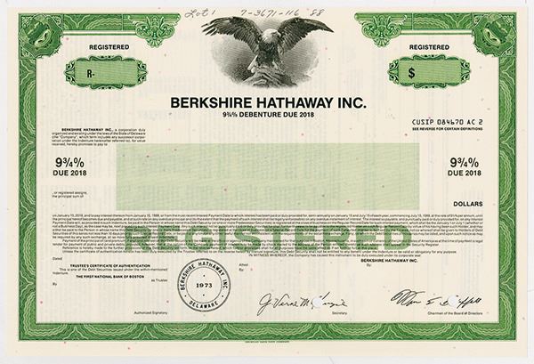 Nebraska (Inc. in Delaware), 1973 (Issued in 1988), $-Odd, 9 3/4% Registered Bond, Green border, POC's, XF, ABNC. Berkshire Hathaway Purchased close to a Billion dollars worth of Coca-Cola stock in 1988, which proved to be one of its best investments. This stock series was issued possibly to finance part of this purchase. Historic company whose shares are approaching $300,000 each. Very rare as a specimen certificate. Uncirculated. ABNC. Facsimile signature of Warren Buffet.
