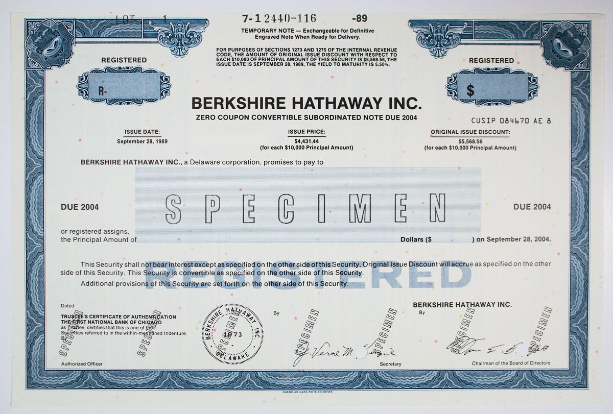 Delaware. $-Odd Registered 5.50% Zero Coupon Subordinated Note Specimen Bond, Blue border with title, Pin-punch Specimen, XF condition, ABNC. (SC-USBNC printed border). Early shares of Warren Buffett's company. The name speaks for itself.