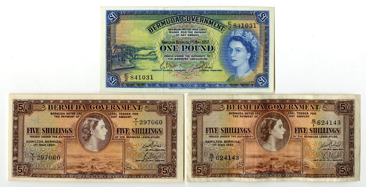 Bermuda..., 1957. Lot of 3 Issued Banknotes, Includes: 5 Shillings, P-18b (2), Brown on m/c underprint with portrait of Queen Elizabeth II at center above Hamilton Harbor; 1 Pound, P-20c, Blue on m/c underprint with Queen Elizabeth II at right and bridge at left. Notes range from VF to AU condition. BWC. (3). Sold "AS IS" no returns accepted.