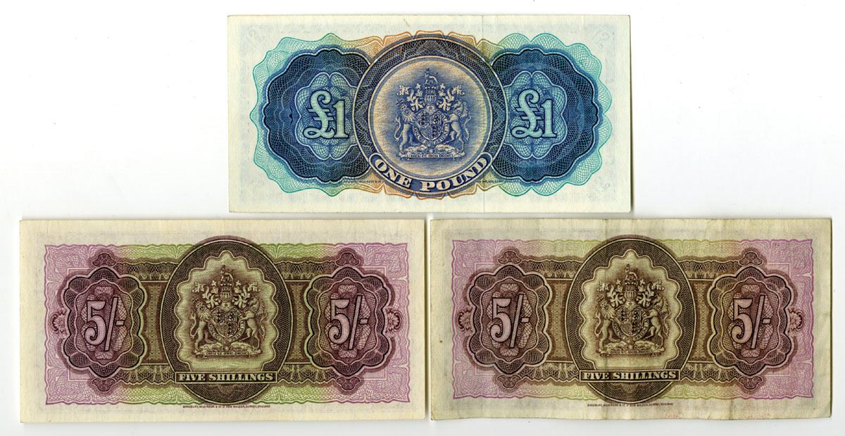 Bermuda..., 1957. Lot of 3 Issued Banknotes, Includes: 5 Shillings, P-18b (2), Brown on m/c underprint with portrait of Queen Elizabeth II at center above Hamilton Harbor; 1 Pound, P-20c, Blue on m/c underprint with Queen Elizabeth II at right and bridge at left. Notes range from VF to AU condition. BWC. (3). Sold "AS IS" no returns accepted.