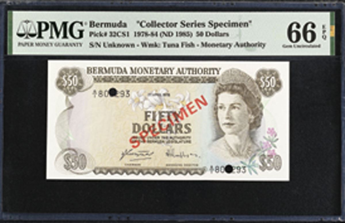 Bermuda, 1978. 50 Dollar, P-32CS1, Collector Series Specimen Banknote, Brown on m/c underprint with young portrait of Queen Elizabeth II at right, Back is brown on m/c with lighthouse at left, S/N has a hole through it, so numbers are missing, Specimen overprints and POCs, PMG graded Gem Uncirculated 66 EPQ.