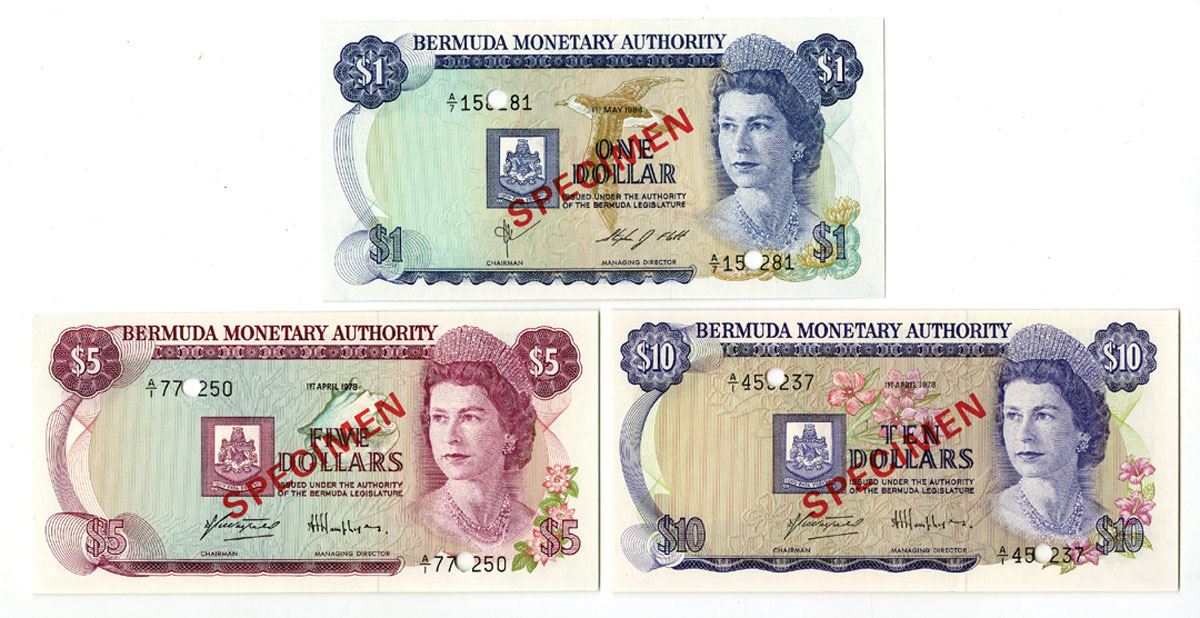 Bermuda, 1978-84. Lot of 3 Specimen Banknotes, Includes: 1984, 1 Dollar, P-28bs; 1978, 5 Dollars, P-29as; 10 Dollars, P-30as. Notes all have Specimen overprints, POCs, and normal Serial Numbers, condition ranges from Choice AU to CU condition. (3). Sold "AS IS" no returns accepted.