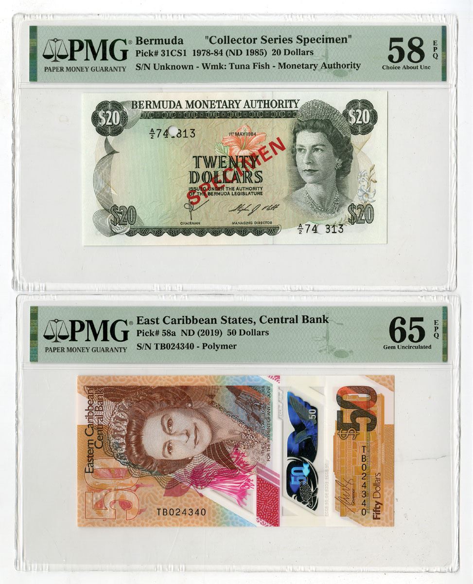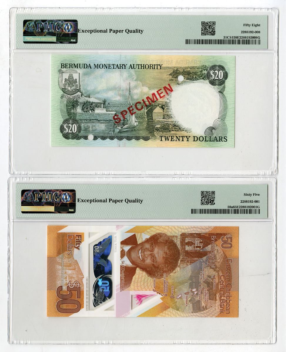 Bermuda & East Caribbean States, Lot of 2 Banknotes, Includes 1984, Bermuda Monetary Authority, 20 Dollars, P-31CS1, Specimen Banknote, S/N A/2 74?813 (Hole Punch Through Missing Digit), PMG graded Choice About Uncirculated 58 EPQ; and, 2019, East Caribbean Central Bank, 50 Dollars, P-58a, Issued Banknote, S/N TB024340, PMG graded Gem Uncirculated 65 EPQ. (2). Sold "AS IS" no returns accepted.