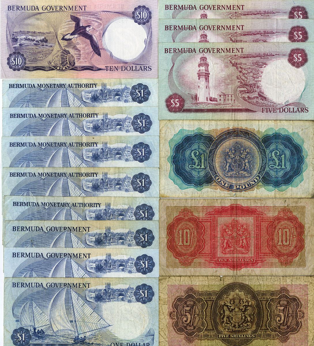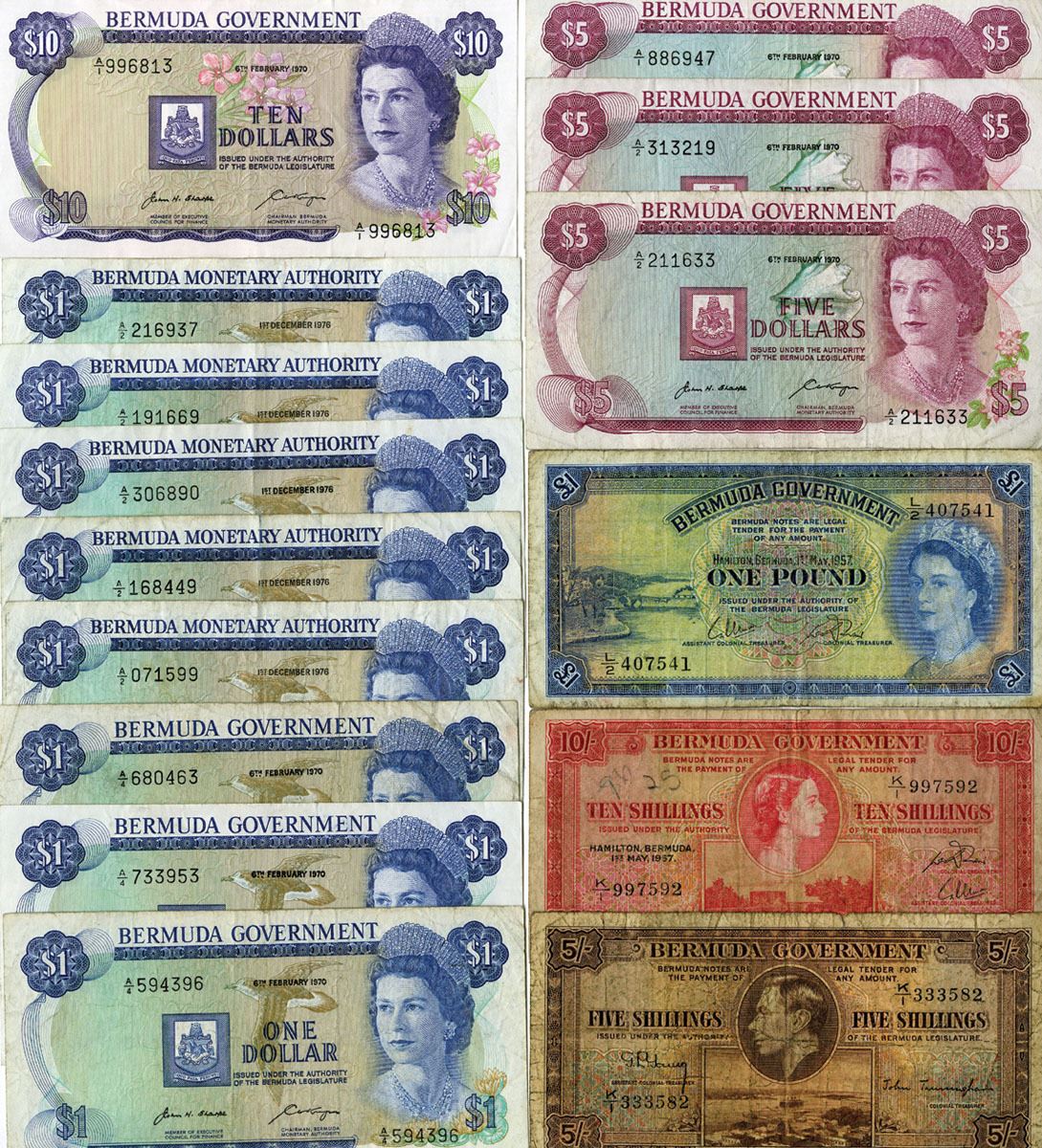 Bermuda, 1937-76. Lot of 15 Issued Banknotes, Includes: Bermuda Government 5/- Shillings, P-8b, 1937, BWC; 10/- Shillings, P-19b, 1957, BWC; 1 Pound, P-20c, 1957, BWC; 1 Dollar, P-23a, 1970 (3); 5 Dollars, P-24a (3), 1970; 10 Dollars, P-25a, 1970; Bermuda Monetary Authority 1 Dollar, P-28a (5), 1976. Notes range from Fine to VF condition. (15). Sold "AS IS" no returns accepted.