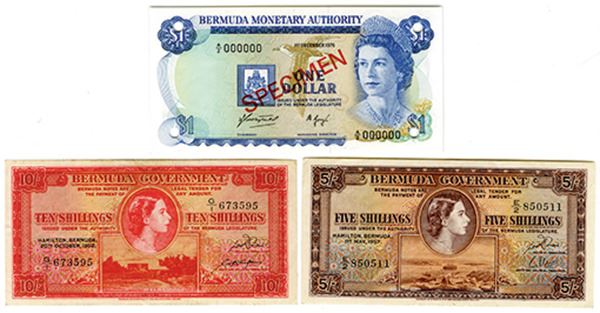 Bermuda. Lot of 3 notes, Includes 1957, 5 Shillings, P-18b, VF to Choice VF; 1952, 10/-, P-19a, VF; and 1976, $1, P-28s Specimen, S/N A/2 000000, Unc. To CU condition. BW&C. (3)