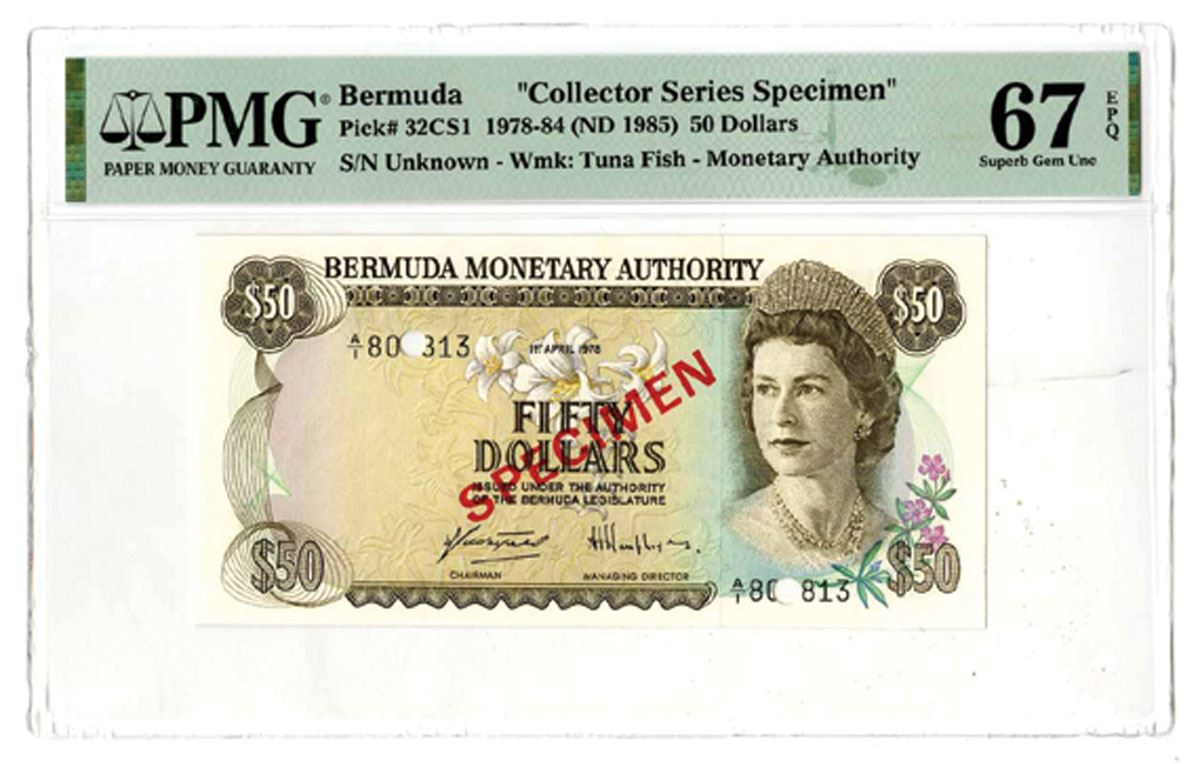 Bermuda, 1978-84 (ND 1985). 50 Dollar, P-32CS1, Collector Series Specimen Banknote, Brown on m/c underprint with young portrait of Queen Elizabeth II at right, Back is brown on m/c with lighthouse at left, S/N has a hole through it, so numbers are missing, Specimen overprints and POCs, PMG graded Superb Gem Uncirculated 67 EPQ. Possibly the highest graded example of this note to be offered at auction.