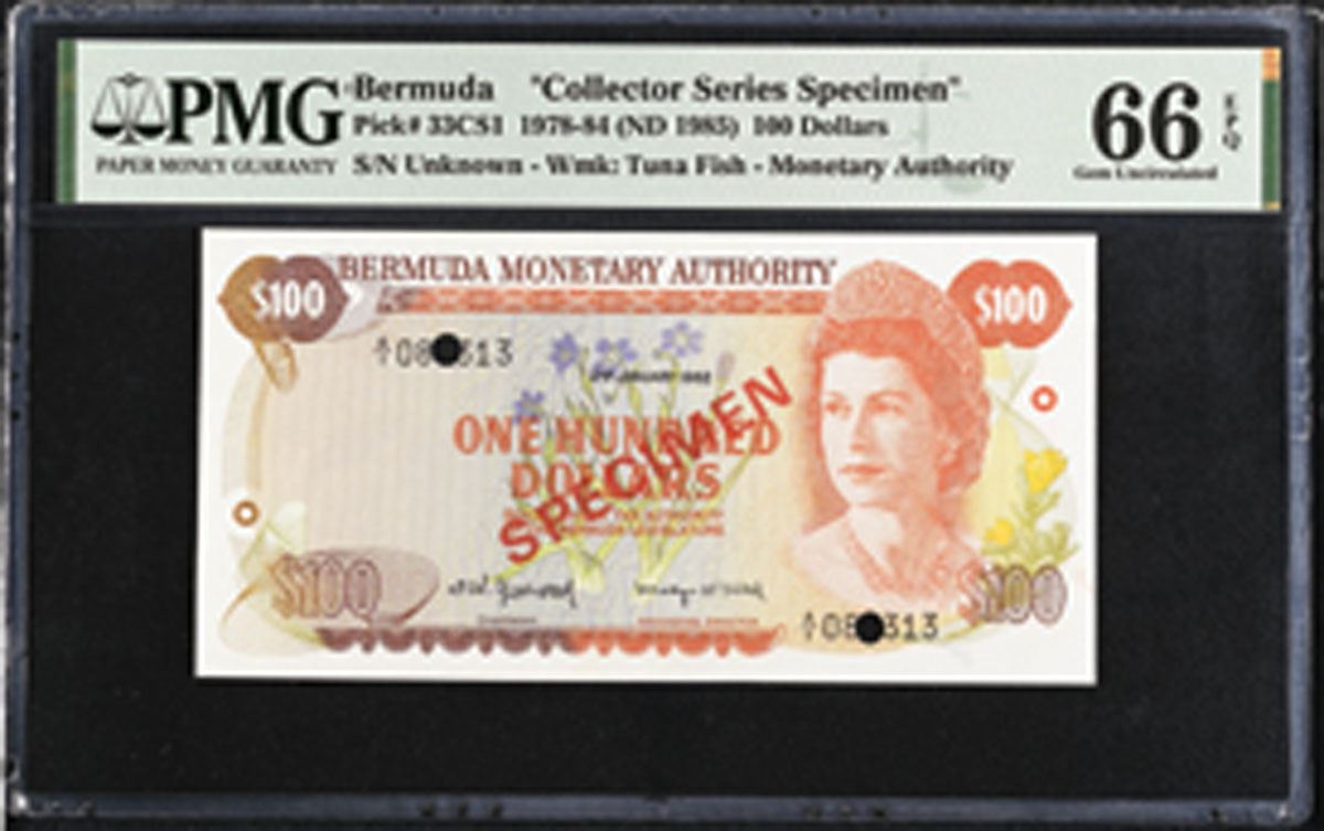 Bermuda, 1982. 100 Dollars, P-33CS1, Specimen Banknote, Orange and brown on m/c underprint with Queen Elizabeth II at right looking 3/4 to the left and arms at center, Back is orange on m/c with House of Assembly at left, Specimen overprint and POC's, PMG graded Gem Uncirculated 66 EPQ.