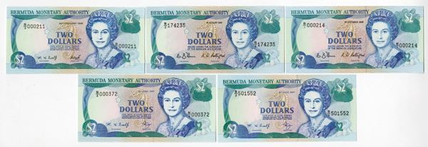 Bermuda. Lot of 5 different $2 notes, Includes prefixes B/1, B/2, B/3 (crossover), and B/4. P-34a (low serial 000214), P-34b, P-40Aa (low serial 000211), 40Ab (2 examples, one with low S/N 000372. All Choice to Gem Uncirculated. (5). (Arthur C. Matz Collection)