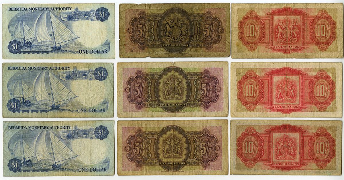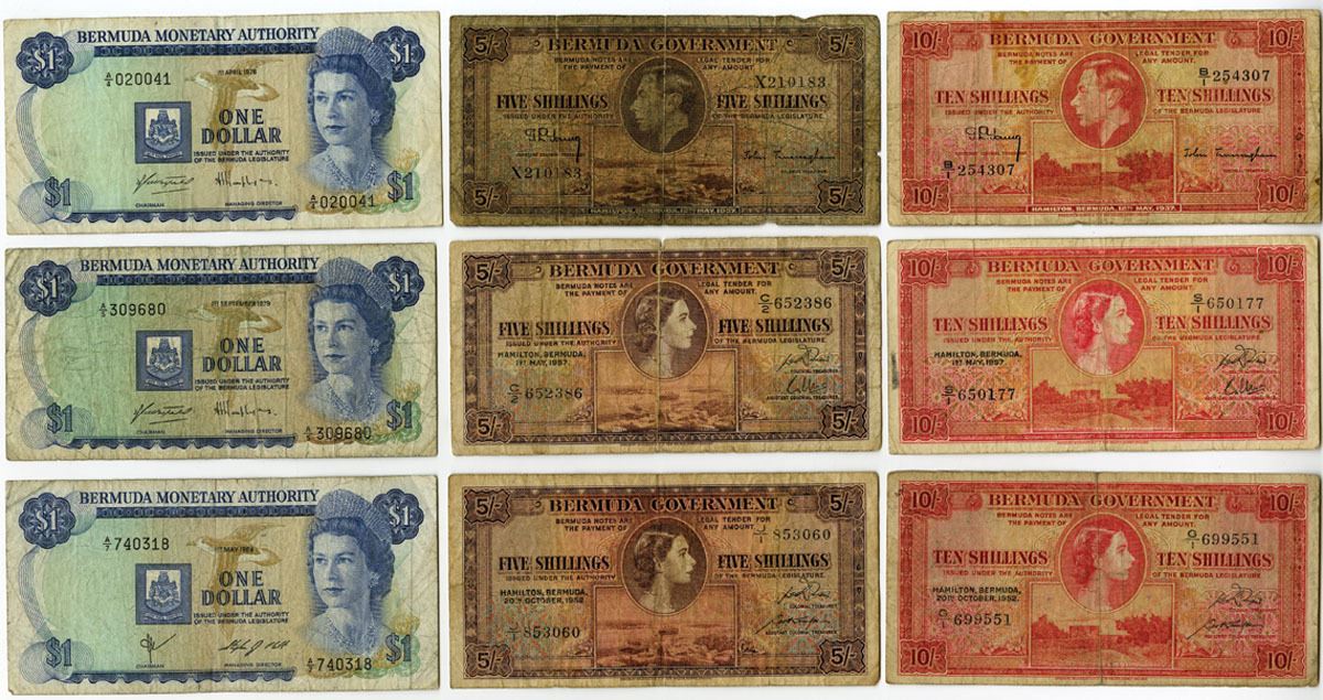 Bermuda, 1937-84. Lot of 9 Issued Banknotes, Includes: Bermuda Government 5 Shillings, P-9b, 1937; 10 Shillings, P-10b, 1937; 5 Shillings, P-18a & 18b, 1952-1957; 10 Shillings, P-19a & P-19b, 1952-57; Bermuda Monetary Authority 1 Dollar, P-28b, 1978-84. Notes range from Fine to VF condition. (9).