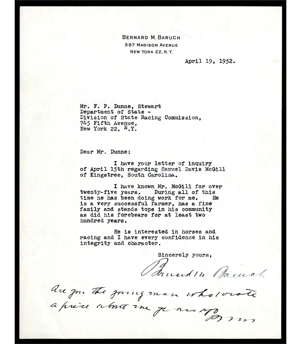 New York, 1952, Bernard Baruch signature on personal letterhead, Letter is Baruch providing a reference to the State Dept for a Samuel D. McGill, VF condition. Baruch (1870-1965) was a financier and stock speculator in the early 20th century, he was also a presidential advisor during the first and second World War's.