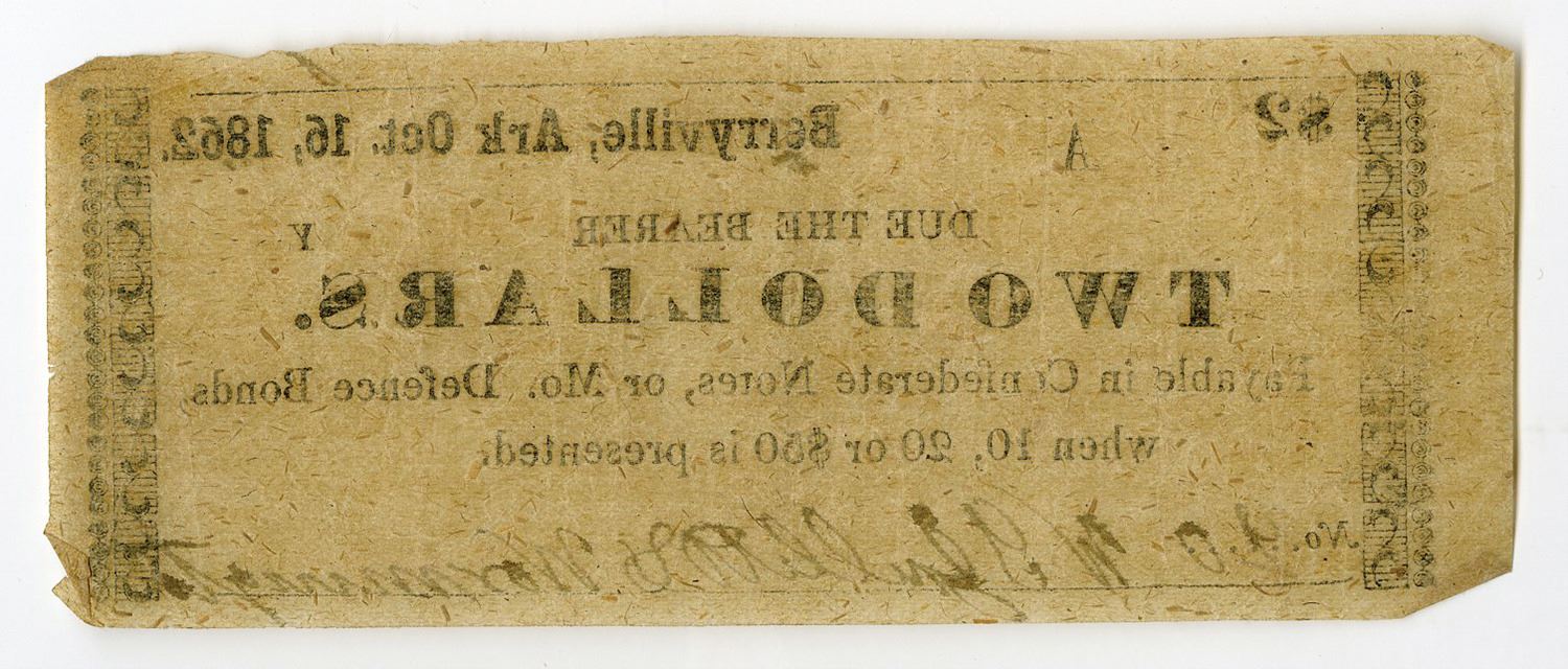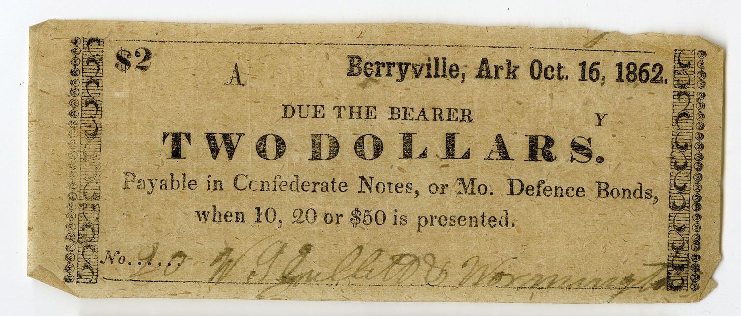 Berryville, Arkansas. October 16, 1862. $2, Unlisted in Rothert and Criswell, Issued obsolete scrip note, Dated October 16th, 1862, "Payable in Confederate Notes, or Mo. Defense Bonds, when $10, $20, or $50 is presented", Black text, signature at bottom in gray ink, S/N 20, VF to Choice VF condition or better. Issuer's name is difficult to make out but appears to be (Julett?) & Wormington. A similar design but lower denomination, 50 Cent, example in lessor condition was auctioned in 2010 by Heritage for $920. This is by far a superior example and has never appeared previously in auction as well as possibly being unique.