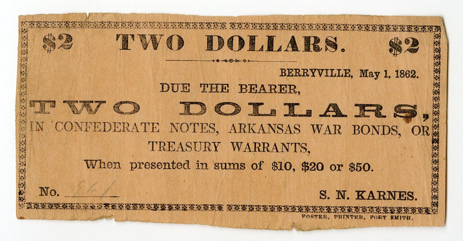 Berryville, Arkansas. May 1, 1862, S.N. Karnes. $2, Unlisted in Rothert, Issued obsolete scrip note, Dated May 1st, 1862, Black text, Plain design, "S.A. Karnes" in pencil on back, Face has text "In Confederate Notes, Arkansas War Bonds, or Treasury Warrants", S/N 961, VF to Choice VF condition with uneven margins and a 3 mm tear on the top left border that is difficult to see, Foster, Printer, Fort Smith. No previous example of this issuer could be found.