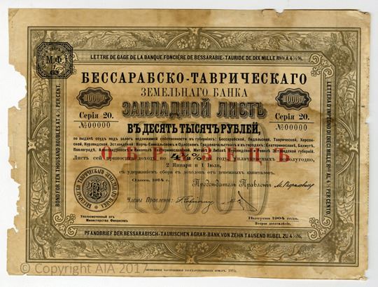 Imperial Russia, 1904, Specimen 10000 Ruble 4.5% bond, small size certificate with no coupons attached, series 20 serial 00000, overprinted "________" in red (Russian for specimen), bank seal at bottom left, ornate beige stained brown frame, text in multiple languages including Russian, French, German, English, and others. Margin tears and damage all around, Fine otherwise.