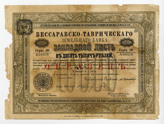 Imperial Russia, 1904, Specimen 10000 Ruble 4.5% bond, small size certificate with no coupons attached, series 20 serial 00000, overprinted "________" in red (Russian for specimen), bank seal at bottom left, ornate beige stained brown frame, text in multiple languages including Russian, French, German, English, and others. Margin tears and damage all around, Fine otherwise.