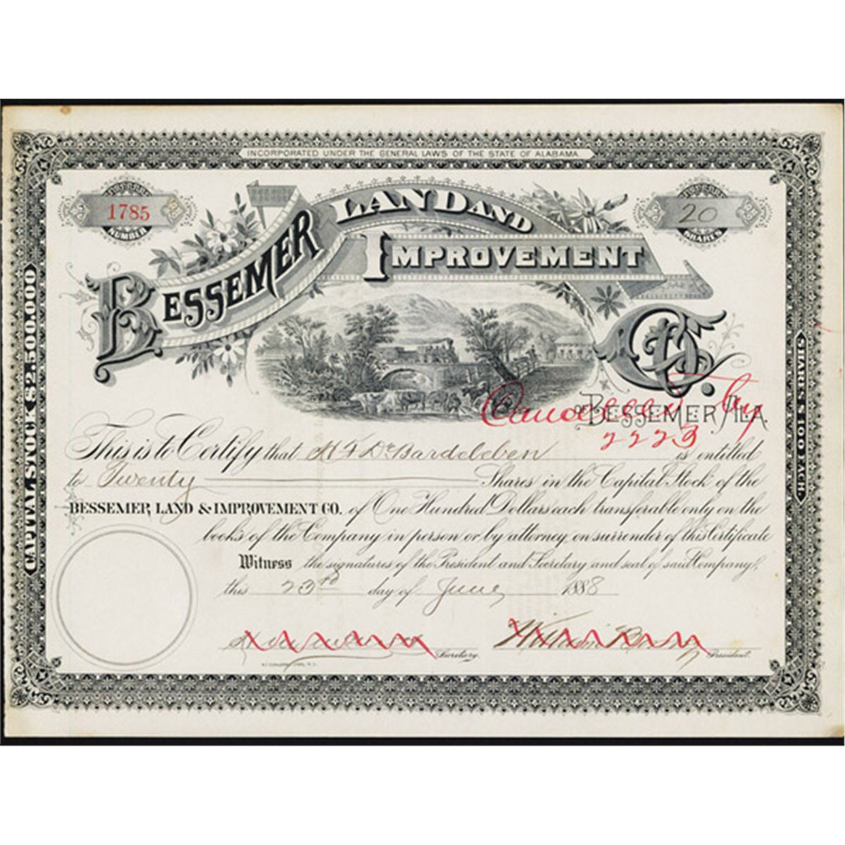 Bessemer, Alabama, 1888, 20 Shs, Issued and ink cancelled, Well known vignette “The Crossing” used on the Montgomery Issue Confederate banknote, XF condition.