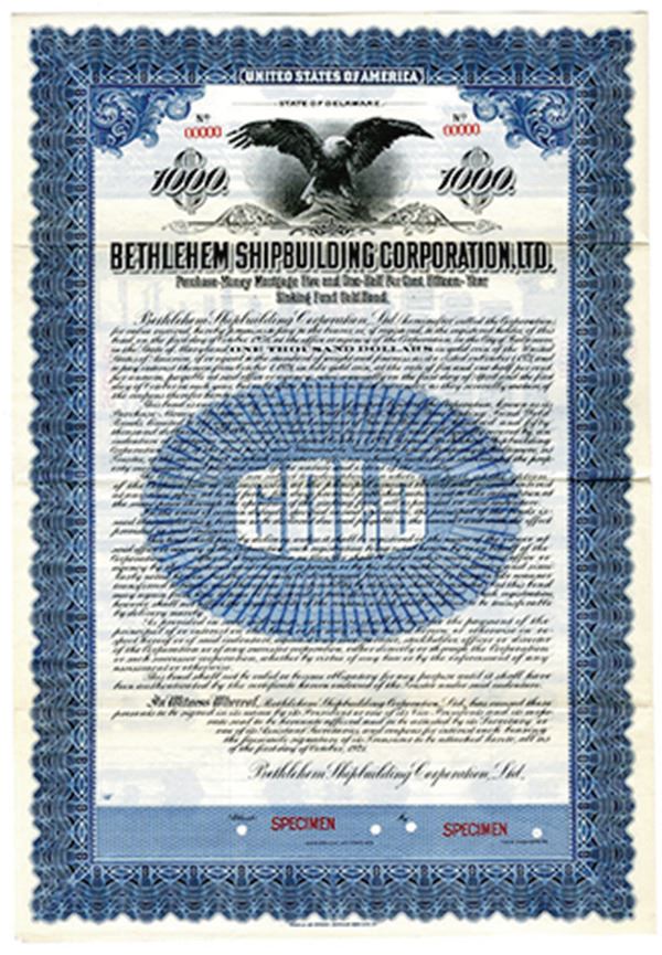 Delaware. $1000 Specimen 5 1/2% Purchase-Money Mortgage Sinking Fund Gold Coupon Bond, Black print on blue border and under tint, Bald Eagle at top, Specimen overprints and POC's, VF-XF condition, FL-ABNC.
