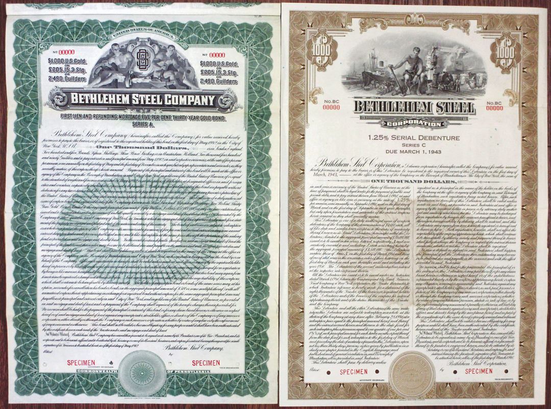 Pennsylvania. Lot includes 2 pieces: 1940, $1000 Specimen 1.25% Serial Coupon Bond in brown; and 1912, $1000 Specimen 5% First Lien and Refunding Mortgage Gold Coupon Bond in green. Both have red specimen overprints, 00000 serial numbers, POCs, and are in VF condition. ABNC. (2)