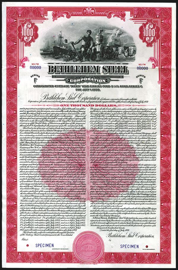 PA. Specimen $1000. 20 Year 3 1/4% Debenture Due 1959. Allegorical man seated between steamship and train, Black on red border, Coupons attached. XF condition. ABNC.