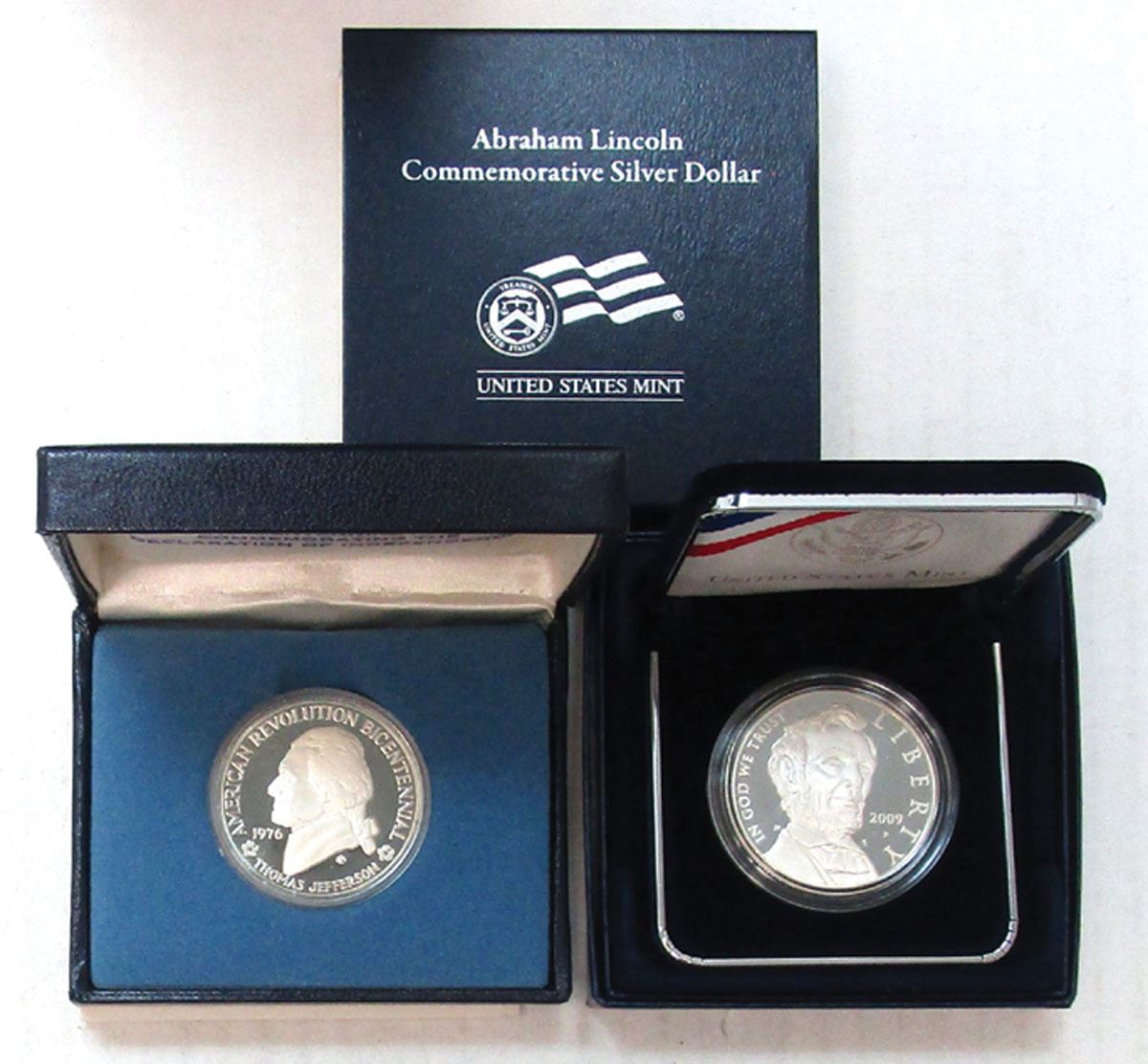 Washington, D.C., 1976 and 2009. Lot of 2 Coins, Includes: 1976 Bicentennial Medal Commemorative the Declaration of Independence featuring Thomas Jefferson on obverse, and Signing of the Declaration of Independence on reverse, Coin is Sterling Silver; United States Mint Abraham Lincoln Commemorative Silver Dollar featuring Lincoln on obverse and last 43 words on the Gettysburg Address on reverse, Coin is 90% Silver. Both coins come in original packaging and have certificate of authenticity. Coins are in Superb proof condition with a total of 55.4 grams of .999 silver with a silver melt of over $60. (2). Sold "AS IS" no returns accepted.